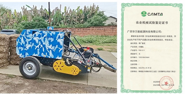 广西华万新能源科技有限公司生产的新型秸秆收集打捆机已通过农业机械试验与推广鉴定。