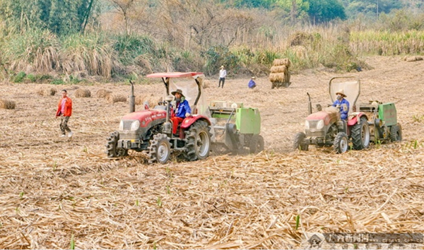去年底今年初,20台这款机子在柳城县2020/2021年甘蔗榨季的“实战”中“大显身手”,帮助一些蔗农轻松而快速地收集甘蔗叶。“以前我们砍收甘蔗后剩下的甘蔗叶,因为人力、精力有限,大多数只能就地焚烧或直接丢弃。”太平镇江头村甘蔗种植大户莫先认在试用这款机子后喜出望外:“现在用机子代劳,它一天的工作量,相当于我们平时100-120人干一天的手工活。这个榨季,我家通过‘机收’甘蔗叶500多吨,按每吨250元左右的收购价,增收了10多万元。”