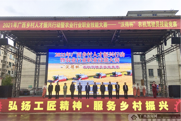 10月21日,由自治区农业农村厅、自治区人力资源社会保障厅、自治区总工会共同主办,自治区农业机械化协会承办的“2021年广西乡村人才振兴行动暨农业行业职业技能大赛——‘沃得杯’农机驾驶员职业技能竞赛”在南宁隆重开幕。