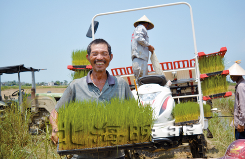 农民莫大叔正在往插秧机搬运秧苗,笑容中充满对丰收的期盼