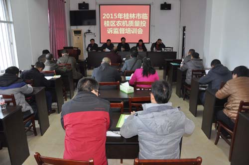 培训会上,临桂区农机局黄杰局长指出,农机质量投诉监督工作关系到农民的利益,关系到农机化事业的健康发展,必须进一步引起重视,应本着为人民服务的宗旨,将农民的利益放在首位,认真负责地将该工作落实好。临桂区农机推广站站长杨志高在会上通报了2015年临桂区农机质量投诉工作情况。
