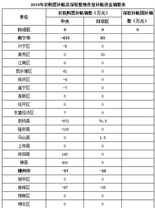 2015年,各级农机化主管部门财政部门密切配合,共同推进我区农机购置补贴工作稳步顺利实施。目前,我区农机购置补贴实施工作已经进入收尾冲刺阶段,大部分县(市、区)的补贴资金已经使用完毕,但仍有少部分县(市、区)完成任务有一定难度。为确保2015年全区农机购置补贴工作任务的全面完成,加快推进农机深松作业补助试点工作,根据各市要求,经商自治区财政厅同意,现对部分县(市、区)2015年农机购置补贴及深松整地作业补贴资金进行调整(见附件),请遵照执行。