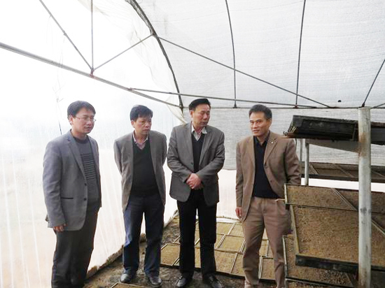 黄铭福局长(左二)在育秧大棚查看育秧情况