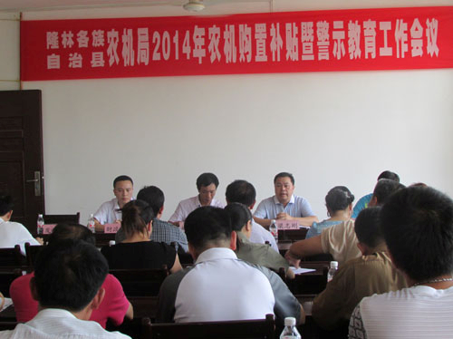 为严格按照政策法规做好一年一度的农机购置补贴工作,5月23日下午,隆林各族自治县农机局组织召开2014年农机购置补贴工作启动会。参加会议的有县农机局、推广站全体干部职工,农机监理站、农机校正副站长、校长等,自治县财政局农业股负责人参会并讲话。