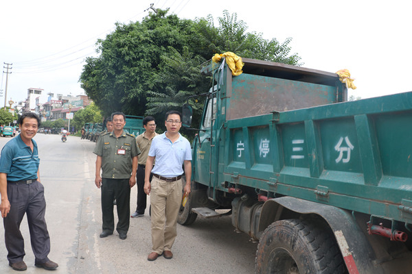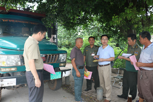 图为港南区农机局谢线来局长、曾希华副局长深入村屯宣传农机安全生产、发放安全生产资料