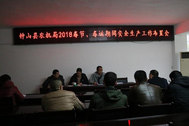 近日,钟山县农机局组织召开2018年春运、春节期间安全生产工作布置会。会议由县农机局钟镇局长主持,局领导班子、局机关干部职工、县各农机二层单位主要领导等10多人参加了会议。