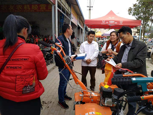 靖西市农机局领导高度重视市农机质量监管工作,3月13日,由韦有斌局长带队的一行四人深入全市各农机产品经销点和农机维修点进行专项检查和监督工作,对存在质量问题的农机产品进行一一排查,对各经销商所销售的农机产品是否有产品合格证、三包凭证、使用说明书是否齐全、产品安全警示标志粘贴是否齐全、规范等情况进行检查。同时重点督查我市6家销售国家农机购置补贴产品经销企业,督查内容包括:经销商是否有工商营业执照和进销台账;是否公开补贴产品基本配置参数、销售价格、补贴额、投诉电话等信息;经销商经销的补贴产品是否有生产企业委托书、销售合同;补贴产品质量保证、售后服务制度是否健全;是否在醒目位置张贴农机购置补贴产品经销商标识和公示本销售点所经营的补贴产品相关情况;经销商是否有违法违规情况等。