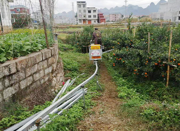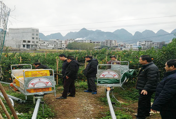 4月27日,在都安县澄江镇桑里村新料沃柑基地,一辆山地轨道运输车正在徐徐的向果园内前进。据基地负责人介绍,400多米长的轨道,运输车往返一次的时间不到20分钟,比人工作业是既省时又省力。农机的有效推广,将结束人挑马驼的传统农业模式,非常适合山丘水果基地推广使用,大大地减轻田间人工劳动强度,减少人工劳动力,不仅提高果园生产效率,而且可以降低生产成本,增加果农经济收入。