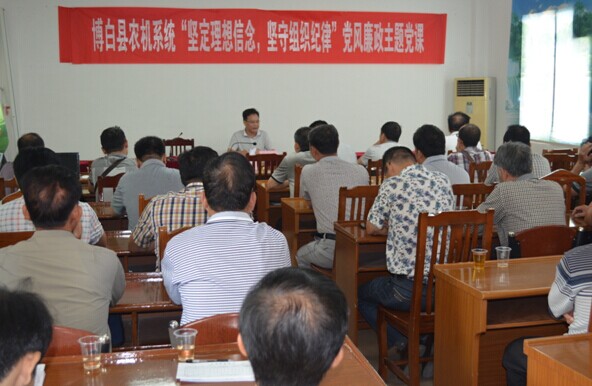 10月14日上午,博白县农机局举办了“坚定理想信念,坚守组织纪律”党风廉政主题党课。该县农机局全体干部职工、县直各农机单位正副职领导及各乡镇农机站站长共计60多人参加此次党课。