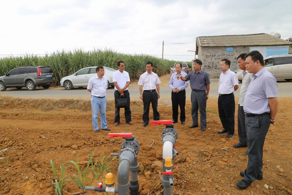 在甘蔗生产基地,调研组查看了甘蔗秧苗的长势,参观了高效节水灌溉机房及甘蔗地里的灌溉设备,并对比了机械化种植的甘蔗秧苗及人工种植的甘蔗秧苗的生长情况。