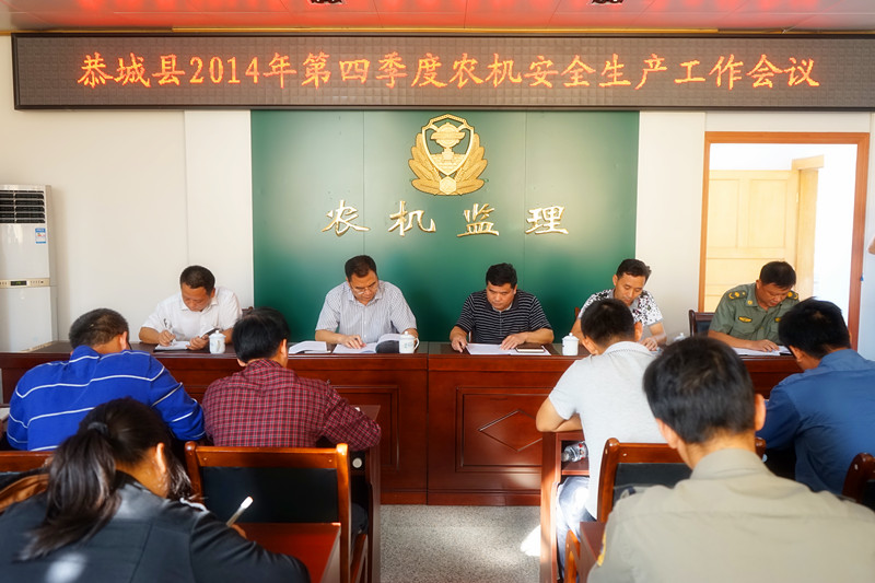 近日,恭城瑶族自治县2014年第四季度农机安全生产工作会议在该县农机局二楼会议室召开。全县各乡(镇)分管农机工作领导及农机管理员、县农机局班子和二层单位主要领导参加会议。会议由县农机局局长伍刚主持,县人民政府副县长叶勇出席会议并作重要讲话。